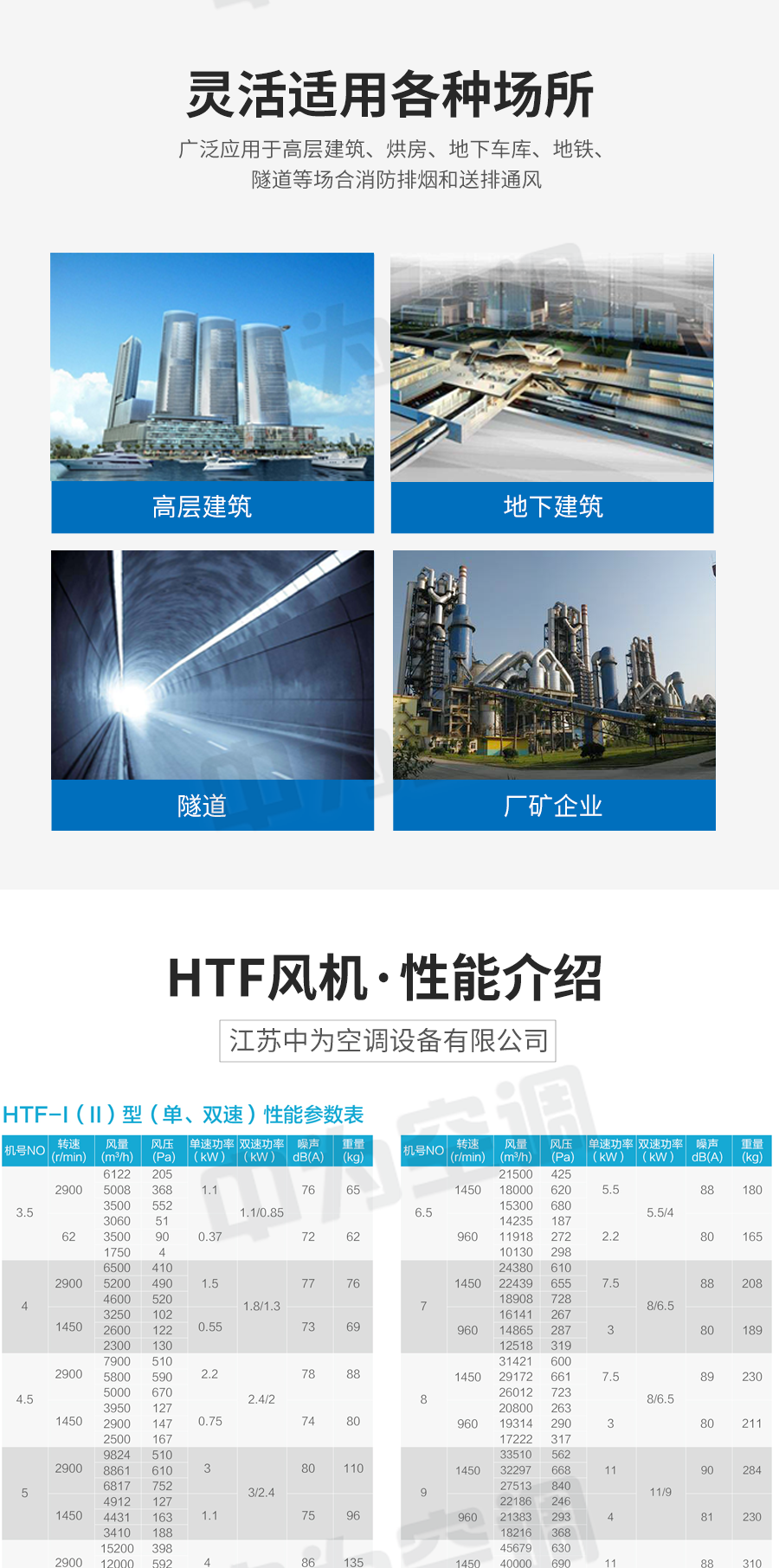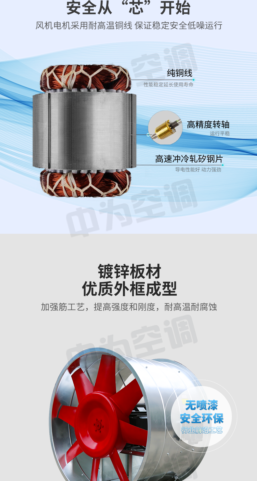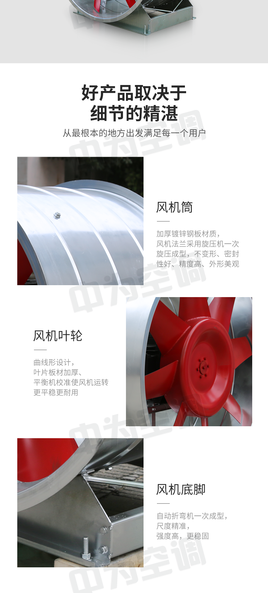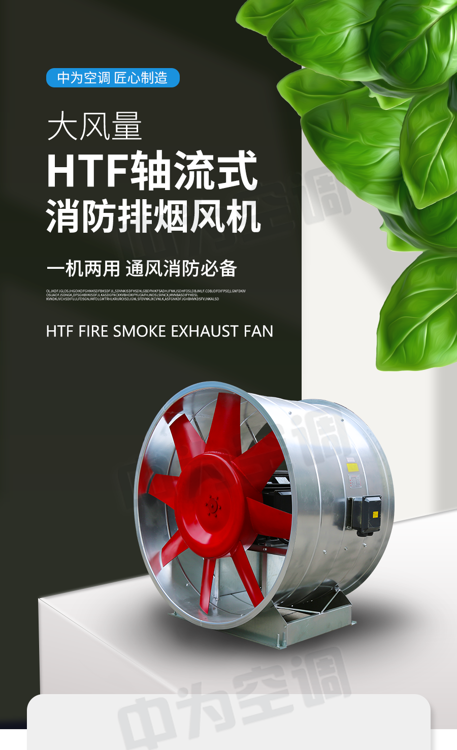 中為消防風機設計獨特,高溫電機全封閉內置,配設專門的電機冷卻系統,采用CAD軟件多目標優化設計的軸流和混流葉輪結構,通過多選驅動形式,達到一機兩用(即常用送排通風和消防使用時高溫排煙),配設電控箱后可遠程自動控制。具有耐高溫性能優良、效率高、體積小,安裝簡便(水平、垂直、吊裝均可)等優點,廣泛應用于高層建筑、烘房、地下車庫、地鐵、隧道等場合消防排煙和送排通風。按GA211-1999按《消防排煙風機耐高溫試驗方法》測定,能在280℃高溫條件下連續運行40分鐘以上,已被全國各大城市消防部門認可采用。