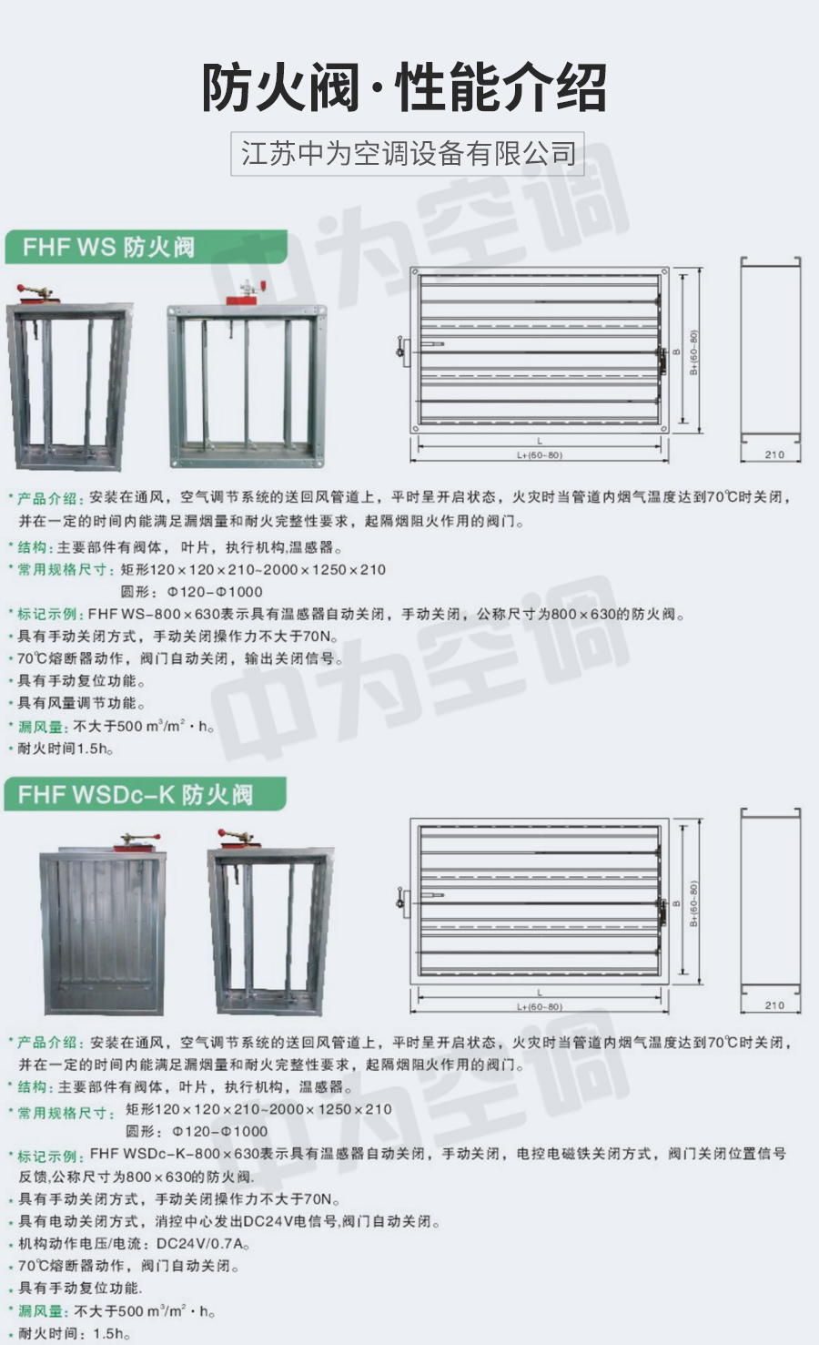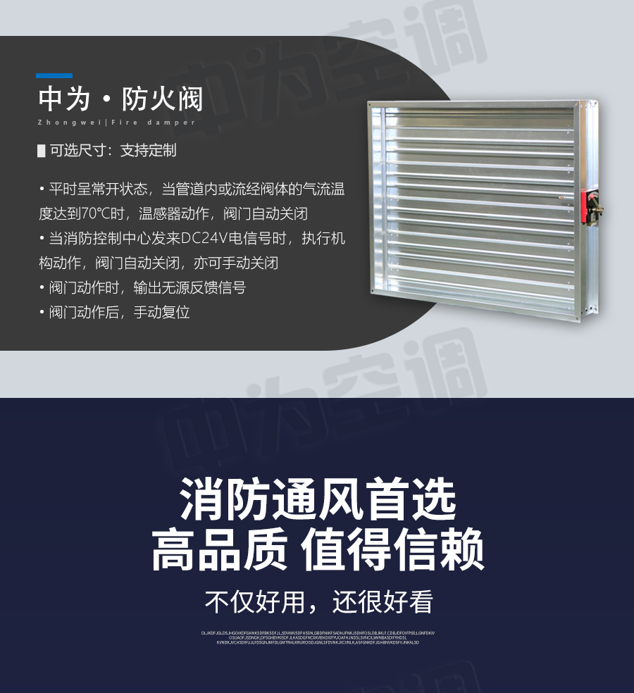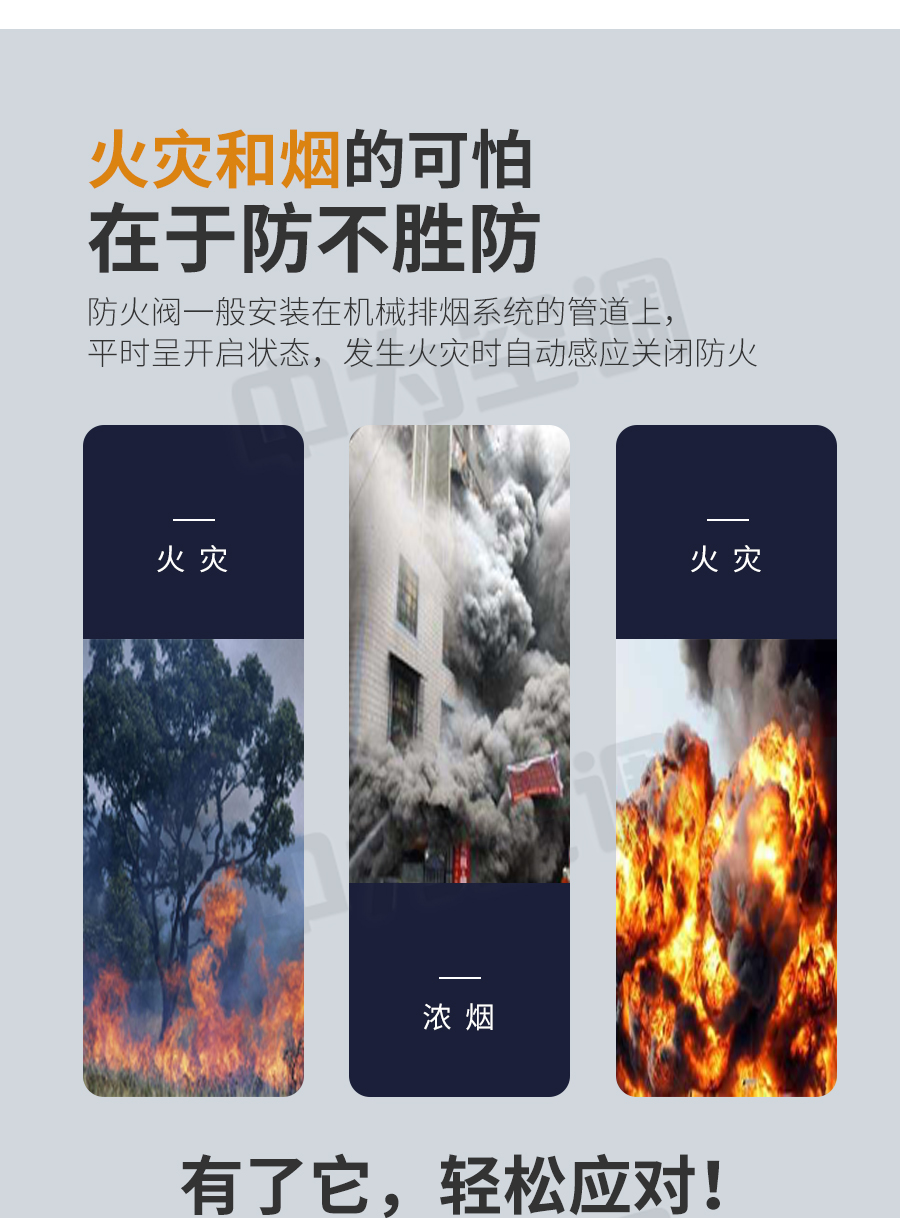 中為防火閥 平時常開,0-90°4擋調節風量; Dc24V電動關閉,溫感器70℃自動關閉,手動關閉,輸出關閉信號; 手動復位。