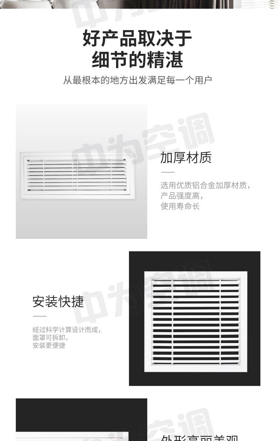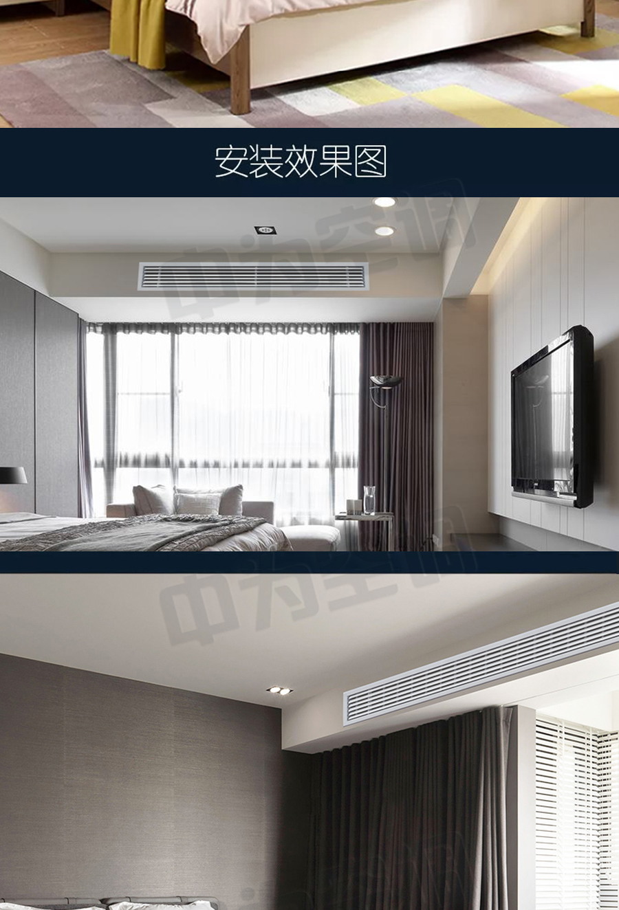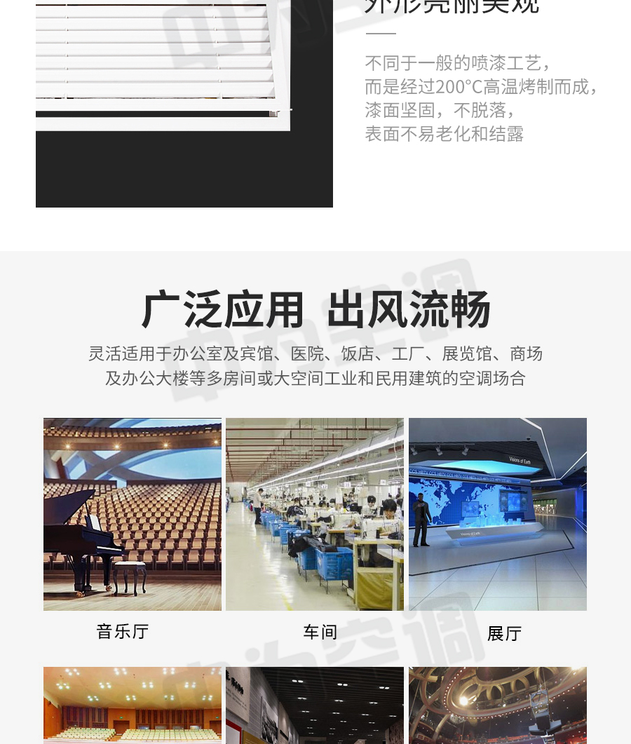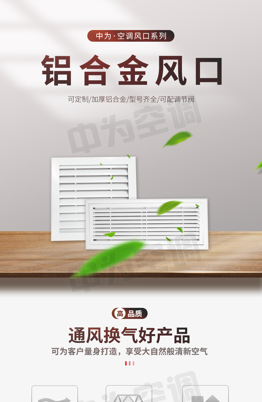 中為鋁合金條形風口做回風口和新風口,風口后面可加鋁板網,尺寸由用戶選定,功能多樣,種類齊全。