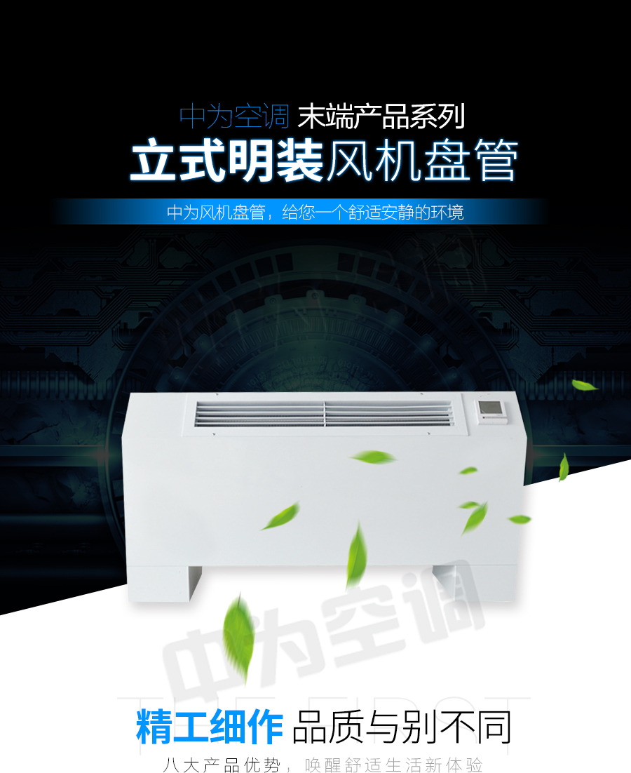 中為立式明裝風機盤管是中央空調理想的末端產品,其工作原理是機組內不斷的再循環所在房間或室外的空氣,使空氣通過冷水(熱水)盤管后被冷卻(加熱),以保持房間溫度的恒定。外形美觀,與新風機組配套后廣泛應用于賓館、醫院、辦公用房、高級會議廳、展覽廳等低噪聲場所。