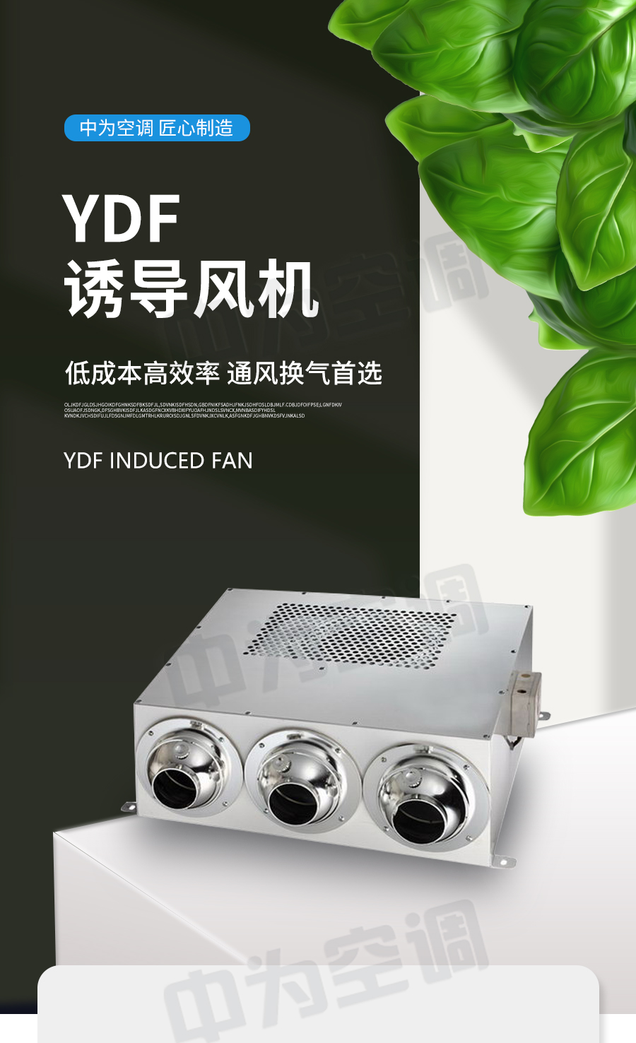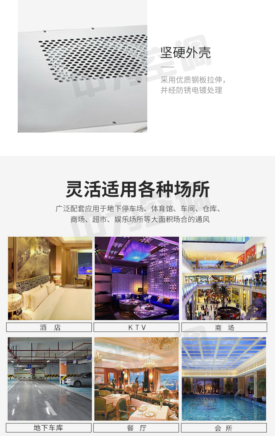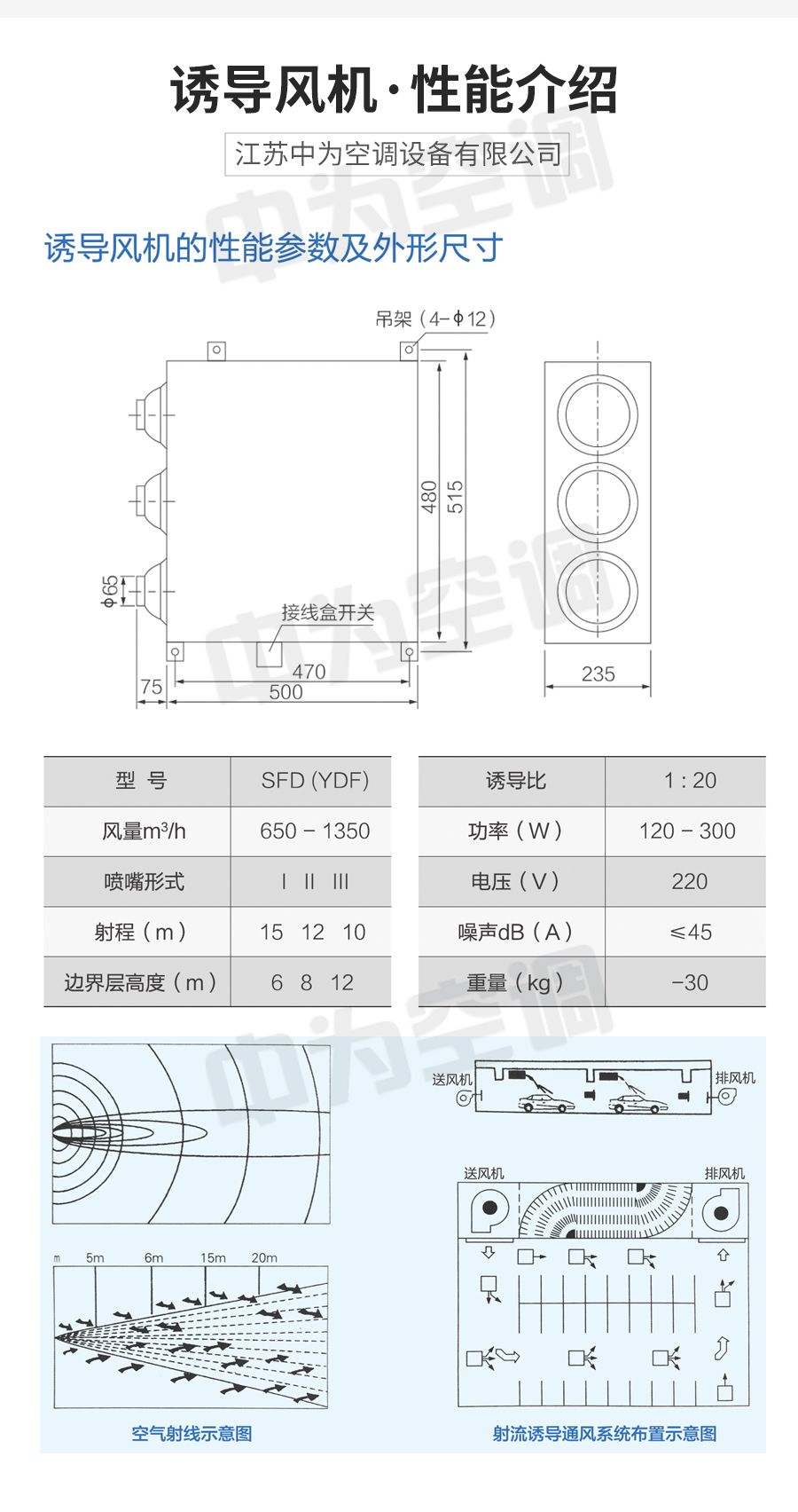 中為誘導風機內置高效率離心風機,具有明顯的噪聲低、體積小、重量輕、吊裝方便(立式、臥式安裝均可),維護簡單,已廣泛配套應用于地下停車場、體育館、車間、倉庫、商場、超市、娛樂場所等大面積場合的通風。